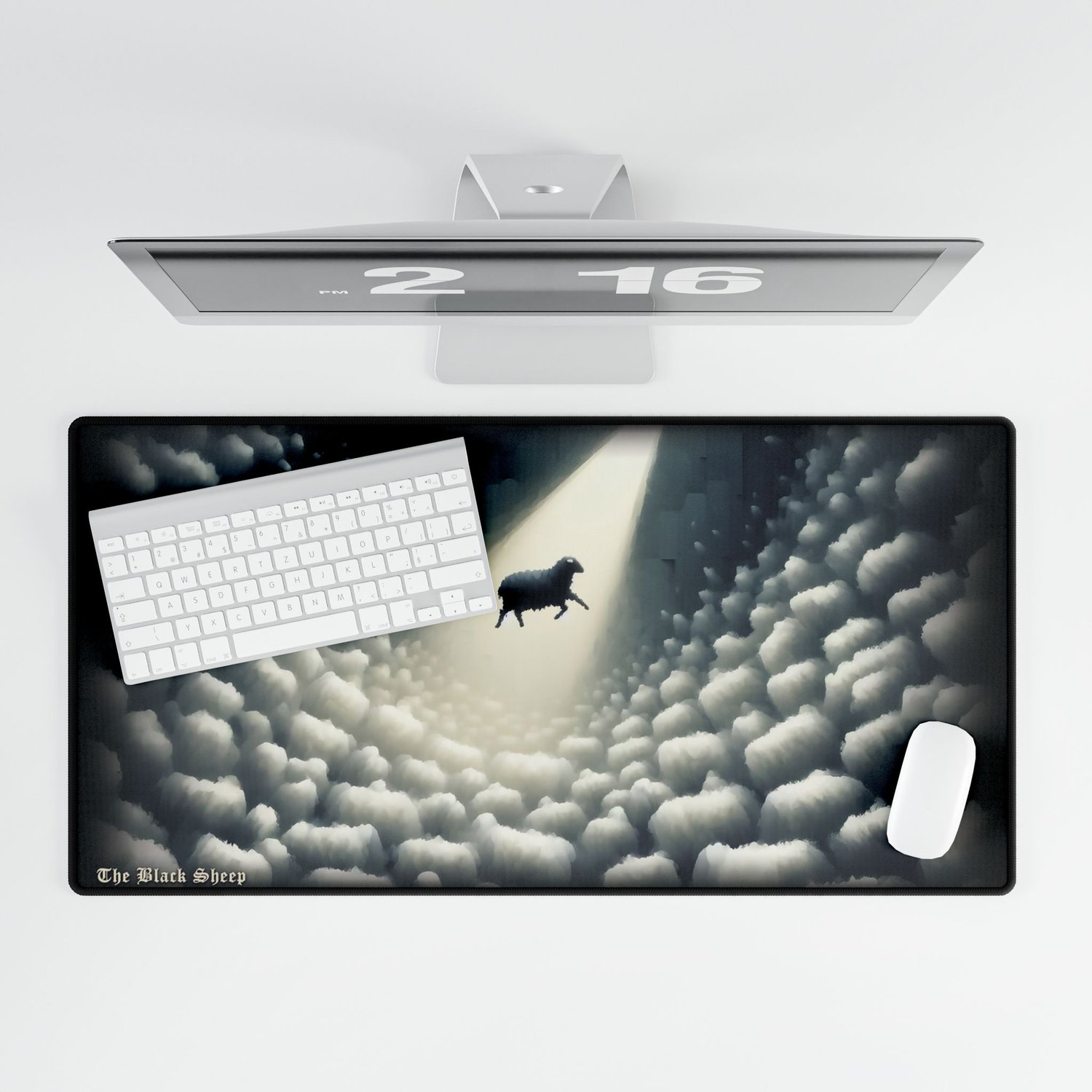 The art from The Black Sheep's launch-day essay printed on a desk mat.